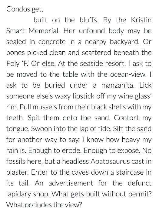 TASIA TREVINO is a writer and musician from the Central Coast of California. Her poems have/will appear(ed) in Fence, Prelude, Dream Pop Press, and poets.org. She’s @initials_tt on Instagram.